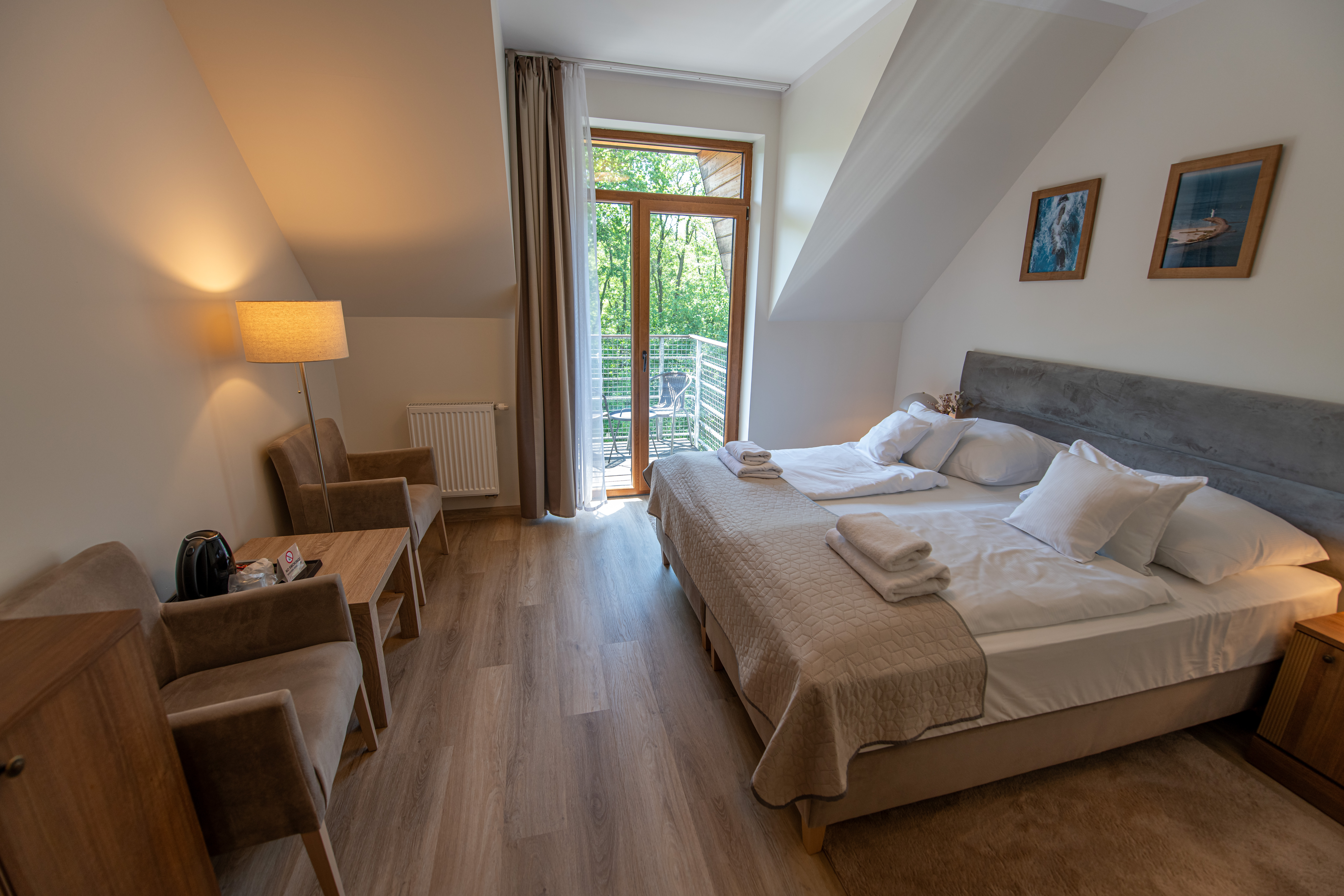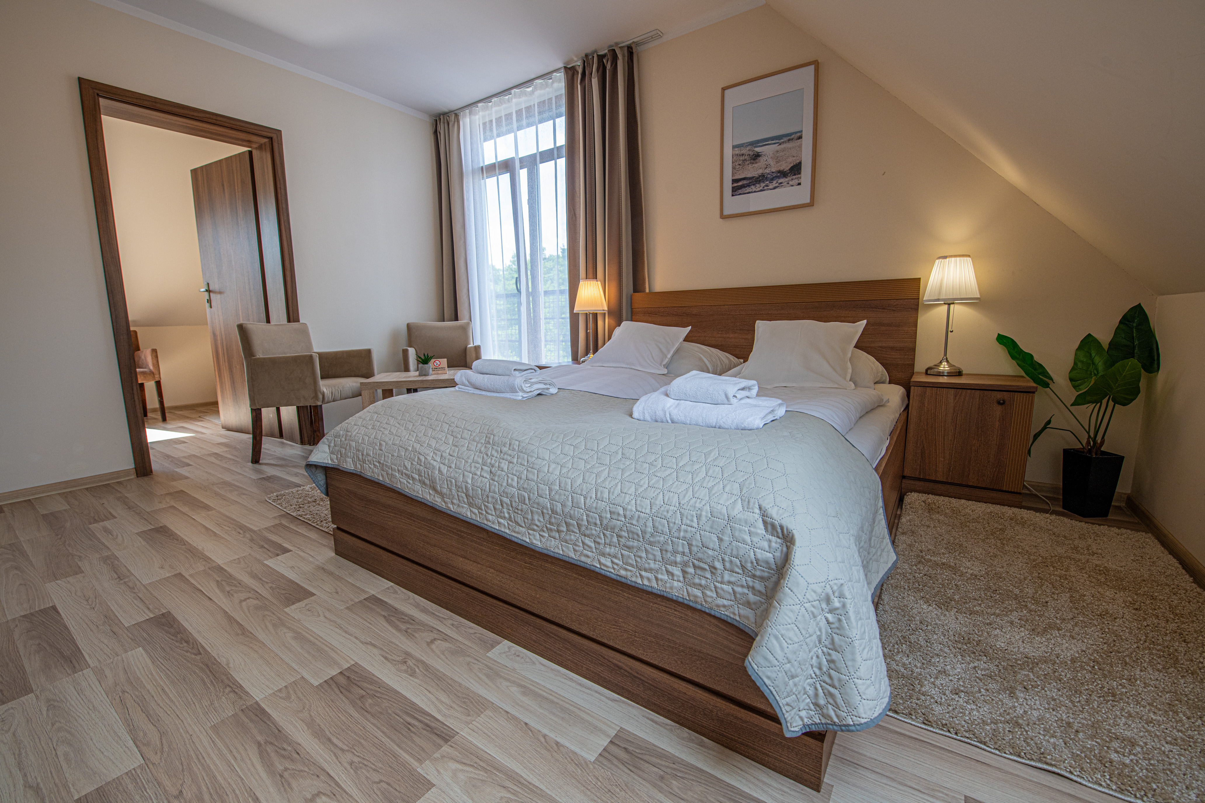 Każdy pokój posiada TV, łazienkę oraz balkon. Gustowna i elegancka aranżacja wnętrz, utrzymana w stonowanej kolorystyce umili Państwu wypoczynek.